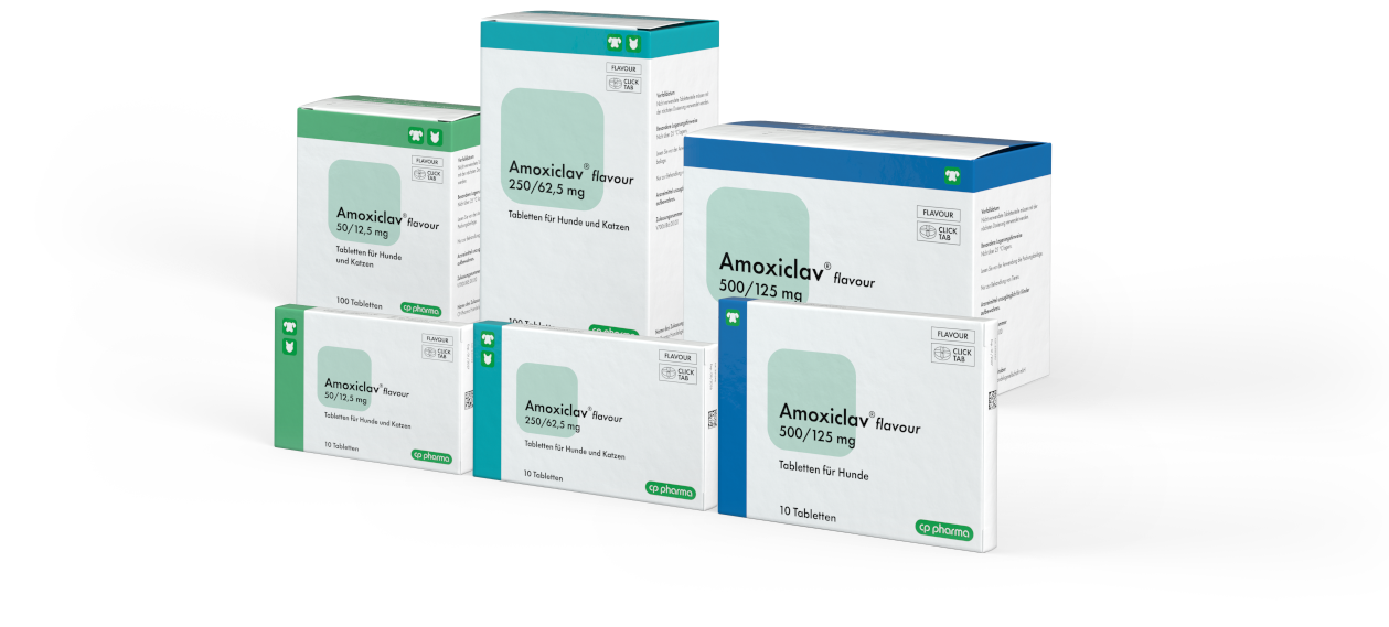 Amoxiclav®flavour wird in den Stärken 50/12,5 mg und 250/62,5 mg für Hunde und Katzen angeboten, für Hunde zusätzlich in 500/125 mg.